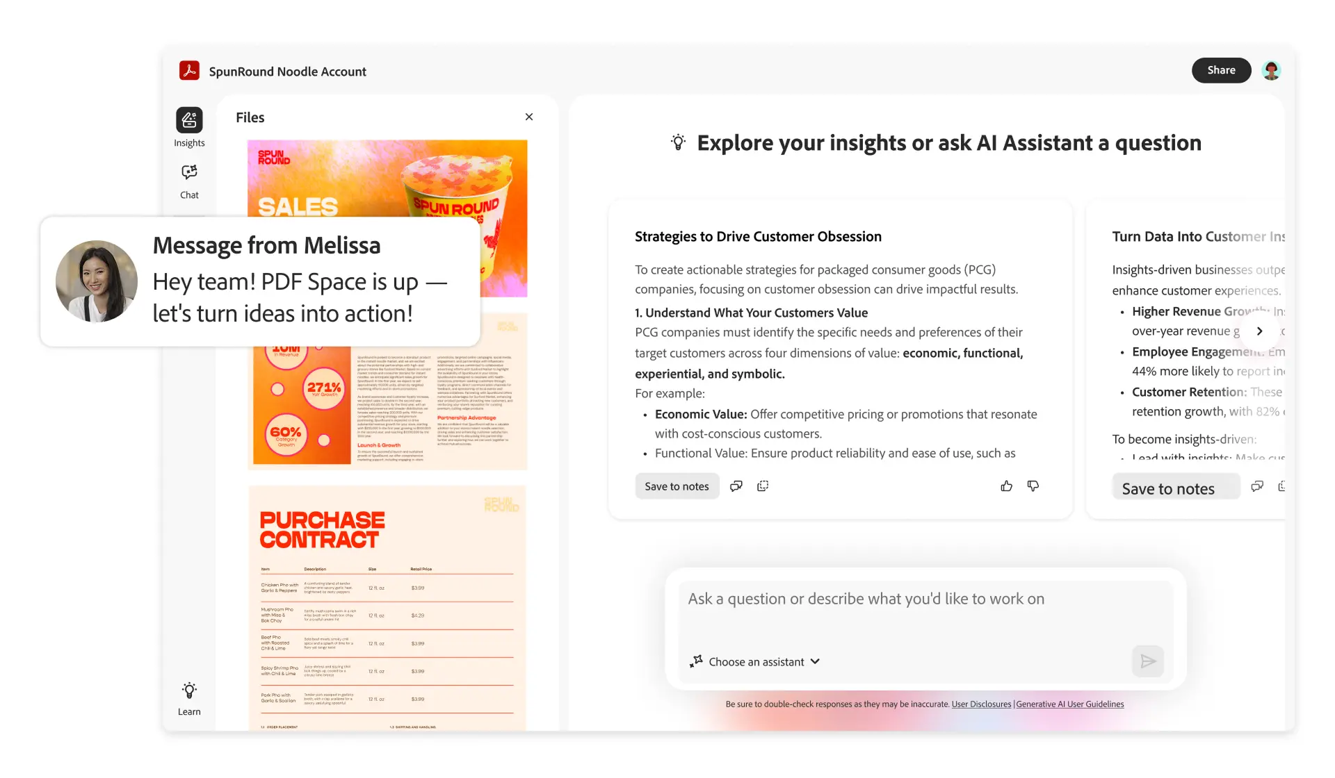 Acrobat AI Assistant hjælper virksomheder med at øge produktiviteten ved at reducere manuelle opgaver og tilbyde intelligente indsigter. Du kan hurtigt opsummere store dokumenter og omdanne dem til handlingsorienterede indsigter, der hjælper dig med at bevare overblikket og accelerere arbejdsprocesser.