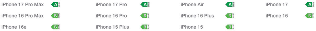Skærmstørrelse: Skærmen har afrundede hjørner. Målt som et rektangel er skærmen 6,86" (iPhone 17 Pro Max), 6,55" (iPhone Air), 6,27" (iPhone 17, iPhone 17 Pro) eller 6,06" (iPhone 16e) diagonalt. Det faktiske visningsområde er mindre.