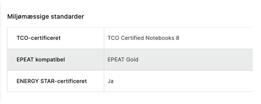 Dels via det logo, der vises i toppen, men også længere nede i afsnittet Miljømæssige Standarder, når du udvider Produktspecifikationer.