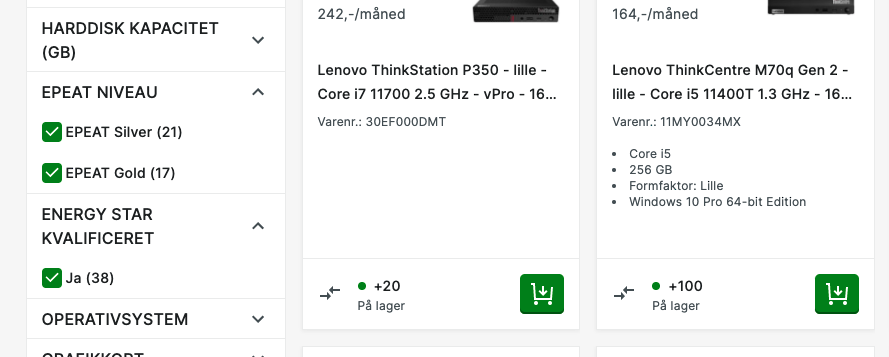 I eShop er det standard at vise bæredygtighed og/eller miljømærker på produktet specifikationer på vores produktkort.
